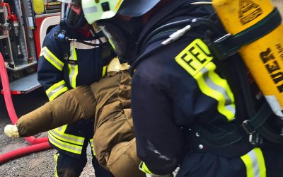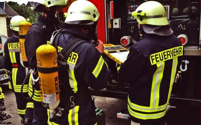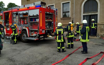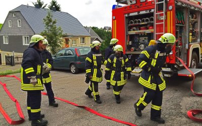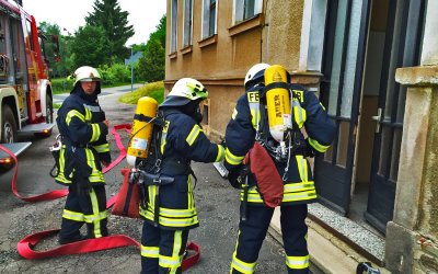 Zum Ausbildungsdienst am 12. Juli 2016 führte die Feuerwehr Rübenau eine Atemschutzübung in der ehemaligen Schule des Ortes durch. In einem der unteren Bilder lässt sich erahnen, unter welchen Bedingungen die Kameraden bei einem Innenangriff arbeiten müssen. Dichter Rauch versperrt die Sicht und erschwert die Suche nach verletzten Personen und Gefahrgut. In der Übung galt es sowohl eine vermisste Person als auch diverse Gefahrstoffe aus dem Gebäude zu bergen. Außerdem wurde ein Außenangriff mit Löschwasserspeisung aus unserem Tanklöschfahrzeug vorgenommen.