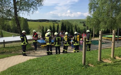 Am 23. Mai 2017 führte die Freiwillige Feuerwehr Rübenau zusammen mit der Freiwilligen Feuerwehr Kühnhaide und der Kita Regenbogen in Rübenau eine Alarmübung durch. Kurz nach 9 Uhr wurde der Hausalarm im Gebäude des Kindergartens ausgelöst und die Erzieher mussten ihre Gruppen so schnell wie möglich und natürlich vollständig ins Freie bringen. Wie bei einem realen Wochentags-Einsatz rückten die Wehren mit einem Zeitpuffer von etwa 12 Minuten dann gegen viertel zehn zur "Einsatzstelle" aus. Diese Verzögerung kommt in vielen Wehren deshalb zustande, da viele Kameraden eine Arbeitsstelle außerhalb ihres Wohnortes haben, und somit einen weiteren Weg zum Gerätehaus überwinden müssen. Bei dem heutigen Übungseinsatz wurde den Kindern ein äußerer Löschangriff demonstriert und sie machten Bekanntschaft mit zwei Atemschutzgeräteträgern, die im Ernstfall zu einem Innenangriff vorgehen, um beispielsweise eine Personenrettung vorzunehmen. Alles in allem konnten wir eine erfolgreiche Übung verzeichnen - ein Dank für die Zusammenarbeit an die Kita Regenbogen.