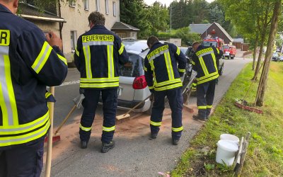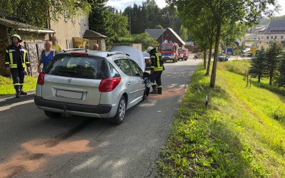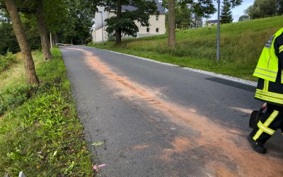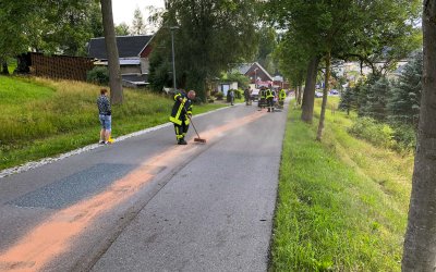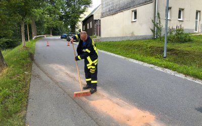 Am 12. August 2019 wurde unsere Wehr gegen 18:02 Uhr mit dem Einsatzstichwort "Auslaufende Betriebsstoffe" zu einem Verkehrsunfall auf die Einsiedler Straße in Rübenau alarmiert. Der 86-jährige Fahrer eines Peugot kam nach einer steilen Linkskurve leicht rechts von der Straße ab und streifte einen Straßenbaum. Anschließend schlitterte der PKW noch gut 30m über die Fahrbahn. Der Fahrer des PKW blieb unverletzt und wurde bis zum Eintreffen der Polizei durch unsere Kameraden betreut. Nachdem wir eine Vollsperrung für den Straßenabschnitt eingerichtet hatten, wurde die durch den Unfall verursachte Ölspur mithilfe von Ölbindemittel abgestumpft. Wir waren mit 11 Kameraden vor Ort und konnten uns gegen 20:15 Uhr wieder einsatzbereit im Gerätehaus melden.