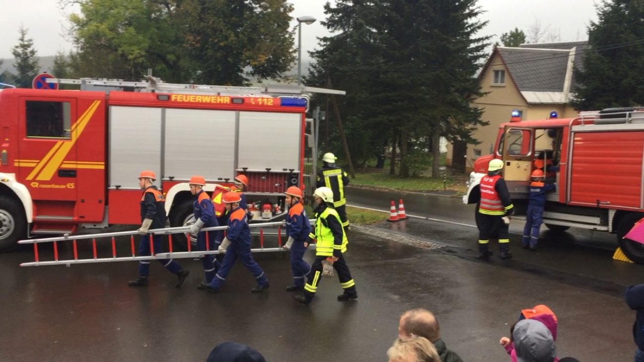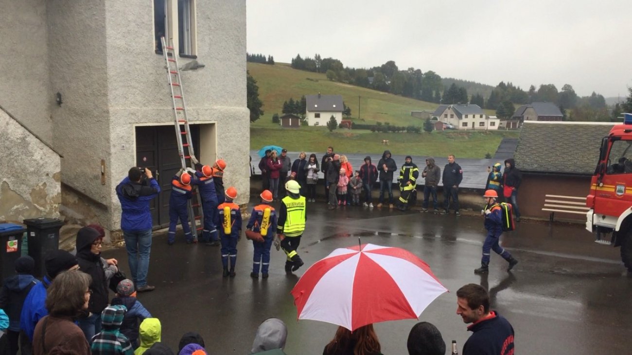 Im Anschluss an das Theaterstück konnten sich die Besucher eine Fettexplosion ansehen, die von einem Kameraden der Feuerwehr Zöblitz durchgeführt wurde - auch dafür einen großen Dank. Gegen 17:00 Uhr führte schließlich unsere Jugendfeuerwehr noch eine Schauübung am Gerätehaus vor. Es wurde ein Wohnungsbrand mit eingeschlossener Person simuliert, bei dem die jungen Kameraden ihr Können unter Beweis stellen konnten. Mithilfe von Steckleitern "rettete" der Angriffstrupp die eingeschlossene Person aus der 1. Etage unseres Depots, währenddessen weitere Trupps zur "Brandbekämpfung" vorgingen. Trotz des schlechten Wetters fanden sich zahlreiche Zuschauer vor dem Gerätehaus ein. Ein Dankeschön an alle Teilnehmer der Jugendfeuerwehr und an die aktiven Kameraden, die die Schauübung organisiert und durchgeführt haben.