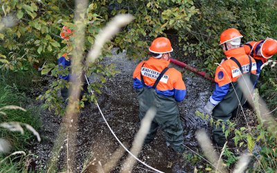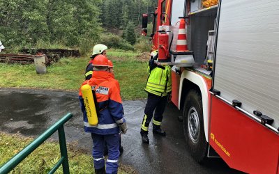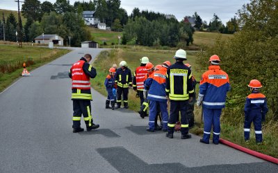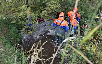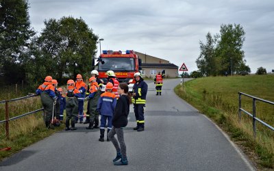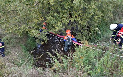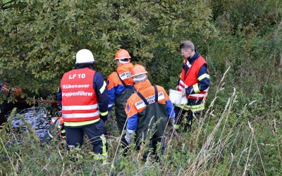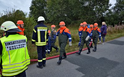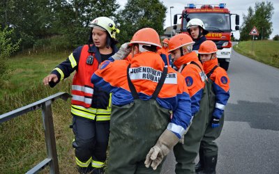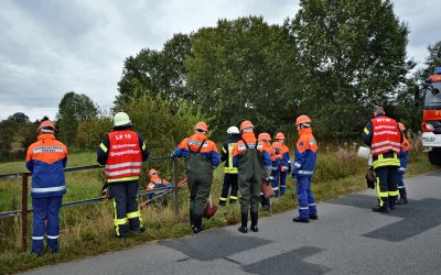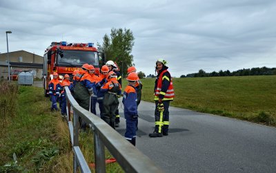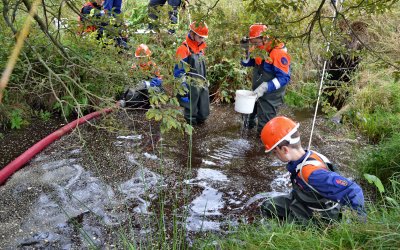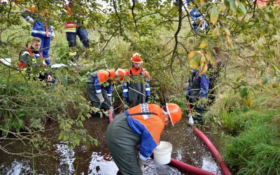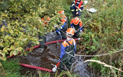 Der nächste Tag begann nach einem ausgiebigen Frühstück mit der Alarmierung zu einem Umweltschaden - "TH1 - Öl auf Gewässer". Am Einsatzort musste im Bereich eines Fließgewässers eine Ölsperre errichtet werden. Anschließend konnte mit einem schimmfähigen Bindemittel der fiktive Ölfilm gebunden und aufgenommen werden.