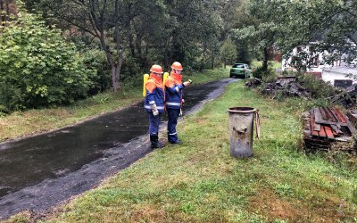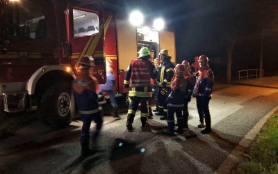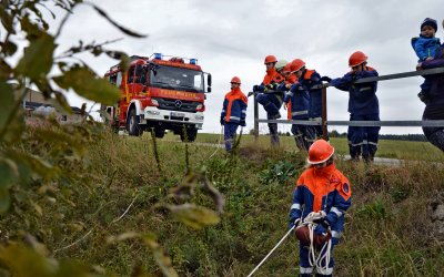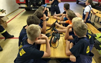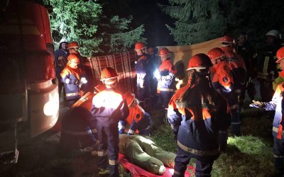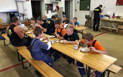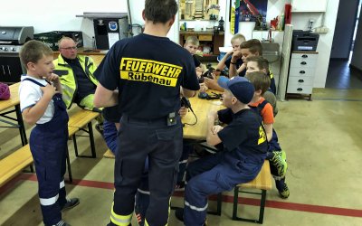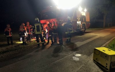 Nach Wiederherstellung der Einsatzbereitschaft im Gerätehaus, war es auch schon Zeit für das Abendbrot. Auf die Pizzarunde folgte ein wenig Freizeit und anschließend gab es für die Teilnehmer einen kleinen Einblick in die Funktechnik der aktiven Abteilung. Gegen 21:00 Uhr ertönte erneut die Alarmsirene mit dem Einsatzstichwort "TH2 - vermisste Person". Nach Ankunft am Einsatzort mussten die jungen Kameraden aufgrund der bereits fortgeschrittenen Dämmerung die Notstrom-Beläuchtungssätze errichten und anschließend konnten einige Trupps zur Personensuche in dem gemeldeten Waldstück vorgehen. Das Übungsdummy wurde erfolgreich gefunden und anschließend mit dem Rettungstuch zur "Patientenbetreuung" nahe der Einsatzfahrzeuge getragen, wo weitere Erste-Hilfe-Maßnahmen getroffen wurden. Nach einer kurzen Auswertung des Einsatzgeschehens im Gerätehaus, ließen wir den Abend in gemütlichem Beisammensein ausklingen.