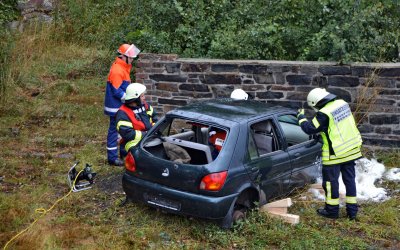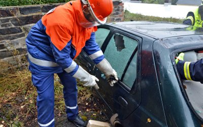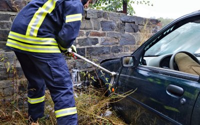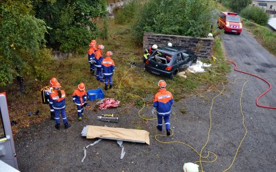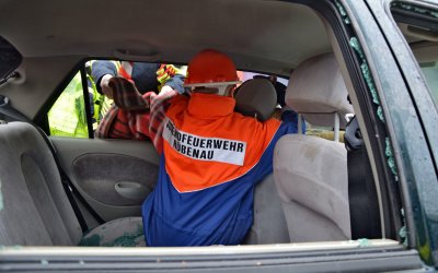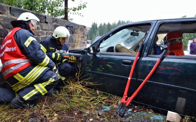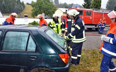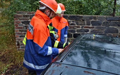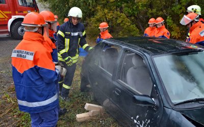 Nach der Kaffeezeit ging es schließlich zur letzten Einsatzübung für dieses Wochenende - "TH2 - Verkehrsunfall eingeklemmte Person // Rauchentwicklung". Nach der "Brandbekämpfung" durch den Angriffstrupp im Motorraum, wurde mit dem Haligan-Tool und der Säbelsäge die verklemmte Fahrertür geöffnet, um den verletzten "Fahrzeugführer" aus dem PKW zu retten. Unterdessen wurde ein Kamerad als innerer Retter zur Patientenbetreuung in den PKW vorgeschickt.