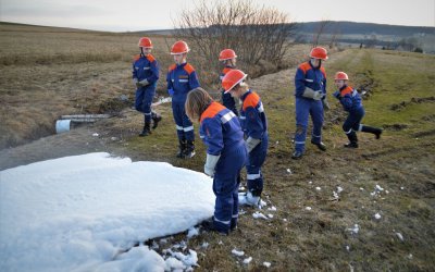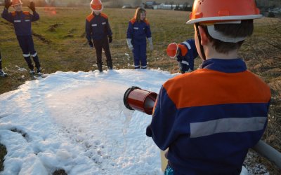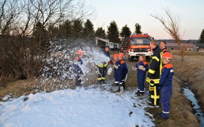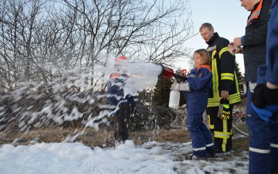 Bei strahlendem Sonnenschein fand am 24. März 2017 der erste Außendienst der Jugendfeuerwehr Rübenau in diesem Jahr statt. Auf dem Plan stand die Schaumausbildung nach Feuerwehrdienstvorschrift (FwDV) 3. Dazu wurde vorerst eine Schaumversorgung mit eigenständigem Zumischer und eigenständigem Schaumrohr trocken aufgebaut - durch diesen Aufbau konnte den jungen Kameraden das zugrunde liegende Prinzip der Schaumerzeugung am besten verdeutlicht werden. Im Anschluss wurde eine alternative Schaumversorgung über unsere, seit knapp einem Jahr auf dem Löschfahrzeug verlastete Schaumpistole, errichtet. Dieses Löschgerät bietet den Vorteil, dass es die zwei Geräte "Zumischer" und "Schaumrohr" aus dem ersten Aufbau in sich vereint, und somit einen aufwendigen Aufbau erspart, da es direkt an der sogenannten "Schnellangriffsleitung" betrieben werden kann. Vielen Dank an die Baufirma Glöß, auf deren Gelände wir die Ausbildung durchführen durften.