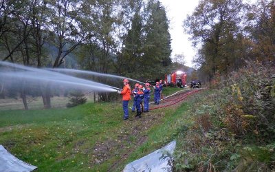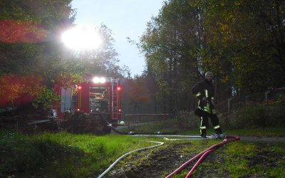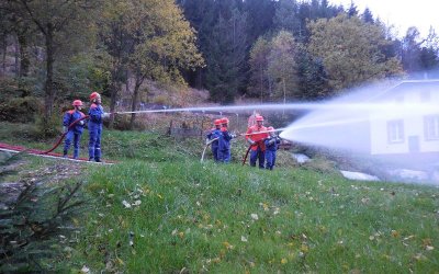 Zum voraussichtlich letzten praktischen Außendienst in diesem Jahr übten wir am 10. Oktober 2014, auch in Vorbereitung auf unser geplantes »Wochenende wie bei der Berufsfeuerwehr« (vom 24.10.2014 bis 26.10.2014), das Vorgehen einer Gruppe im Löscheinsatz. Alle hatten Spaß am Auf- und Abbau, nicht zuletzt Aufgrund der neuen Technik unseres LF 10, mit der wir uns heute zum allerersten Mal praktisch vertraut machten.