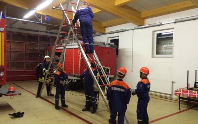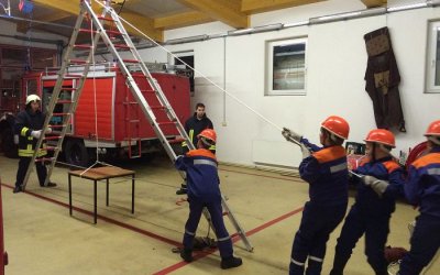 Wie schon im Frühjahr diesen Jahres übte die Rübenauer Jugendfeuerwehr am 21. November 2014 den Umgang mit tragbaren Leitern. Unter anderem wurde ein Wasserauffangbecken aus den Steckleitern gebaut, welches im Einsatz als Puffer verwendet werden kann. Auch als Gestell für eine Tiefenrettumg in einem Schacht kann eine Bockleiter aus zwei zusammengestellten Leiterobjekten dienen.