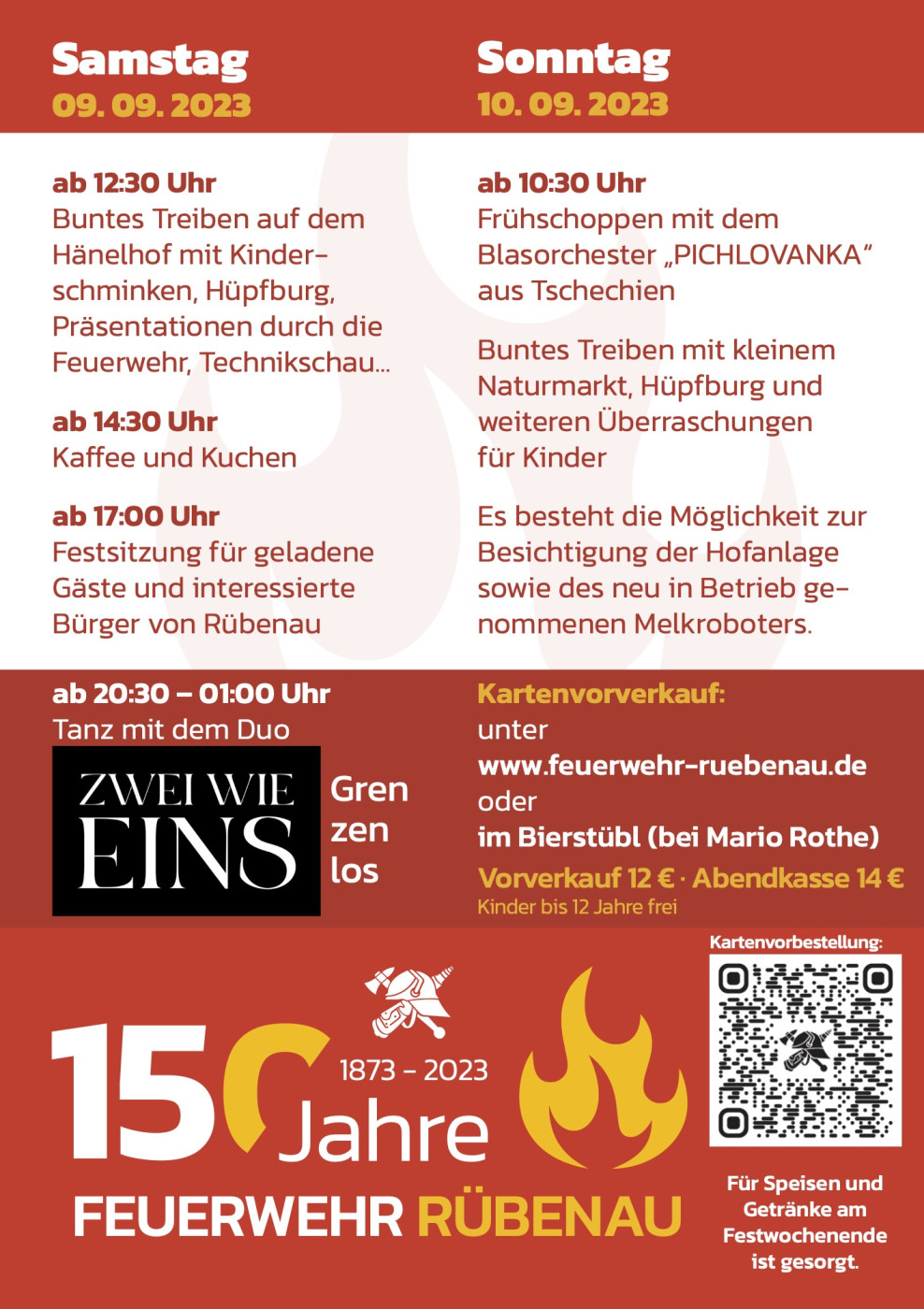 Anlässlich unseres 150-jährigen Bestehens findet am Festwochenende vom 09.09. - 10.09.2023 ein Tanzabend mit dem Duo "ZWEI WIE EINS" (Grenzenlos) am 09. September 2023 ab 20:30 Uhr in den Räumlichkeiten des Landwirtschaftsbetriebes Mirko Hänel statt. Ein Programmflyer befindet sich unterhalb des Formulars.